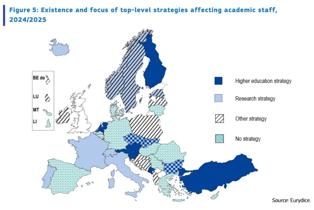 - Raportul CE privind „Personalul academic în Europa – 2025”, publicat pe platforma europeană dedicată educației Eurydice – prezintă România în rândul țărilor în care nu există nicio strategie majoră care să-i țintească pe profesorii universitari. În cazul României sunt consemnate doar reforme care au acoperit și corpul academic.