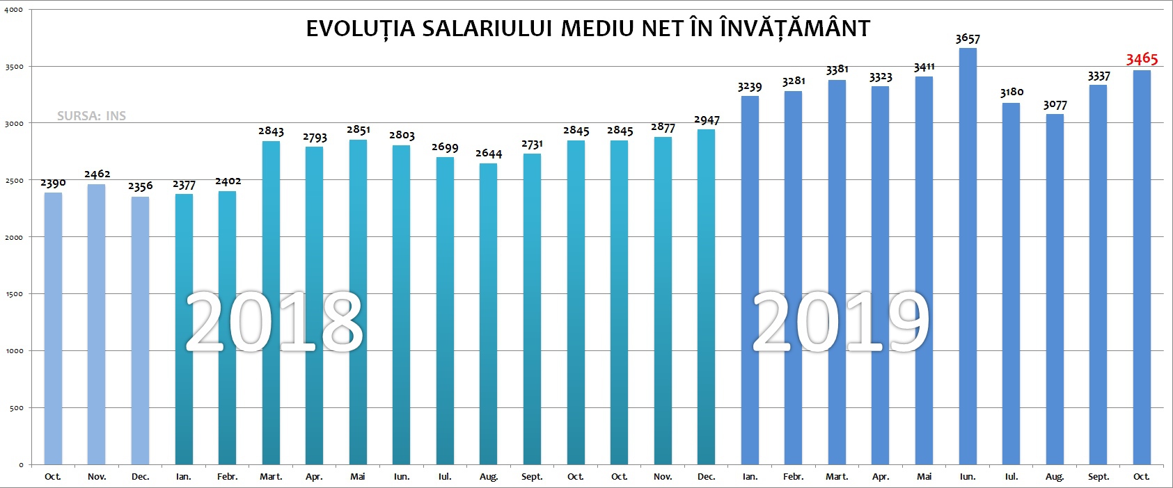 În luna octombrie 2019 în învăţământ a avut loc cea mai mare creştere faţă de luna precedentă a salariului mediu net din întreg sectorul bugetar, potrivit INS. Este vorba despre o creştere de 3,8%, creştere pusă de INS pe seama acordării sumelor reprezentând plata cu ora a cadrelor didactice, după ce în perioada vacanţei şcolare (iulie, august) aceste sume au fost suspendate.