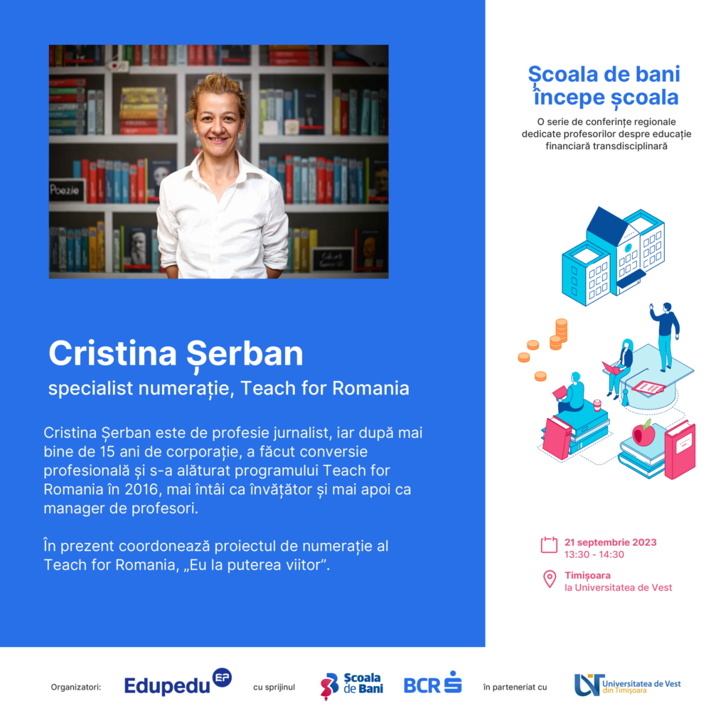 14:30 – 14:40 Programul național de numerație: Cristina Șerban, Teach for Romania, coordonator program de numerație „Eu la puterea viitor”