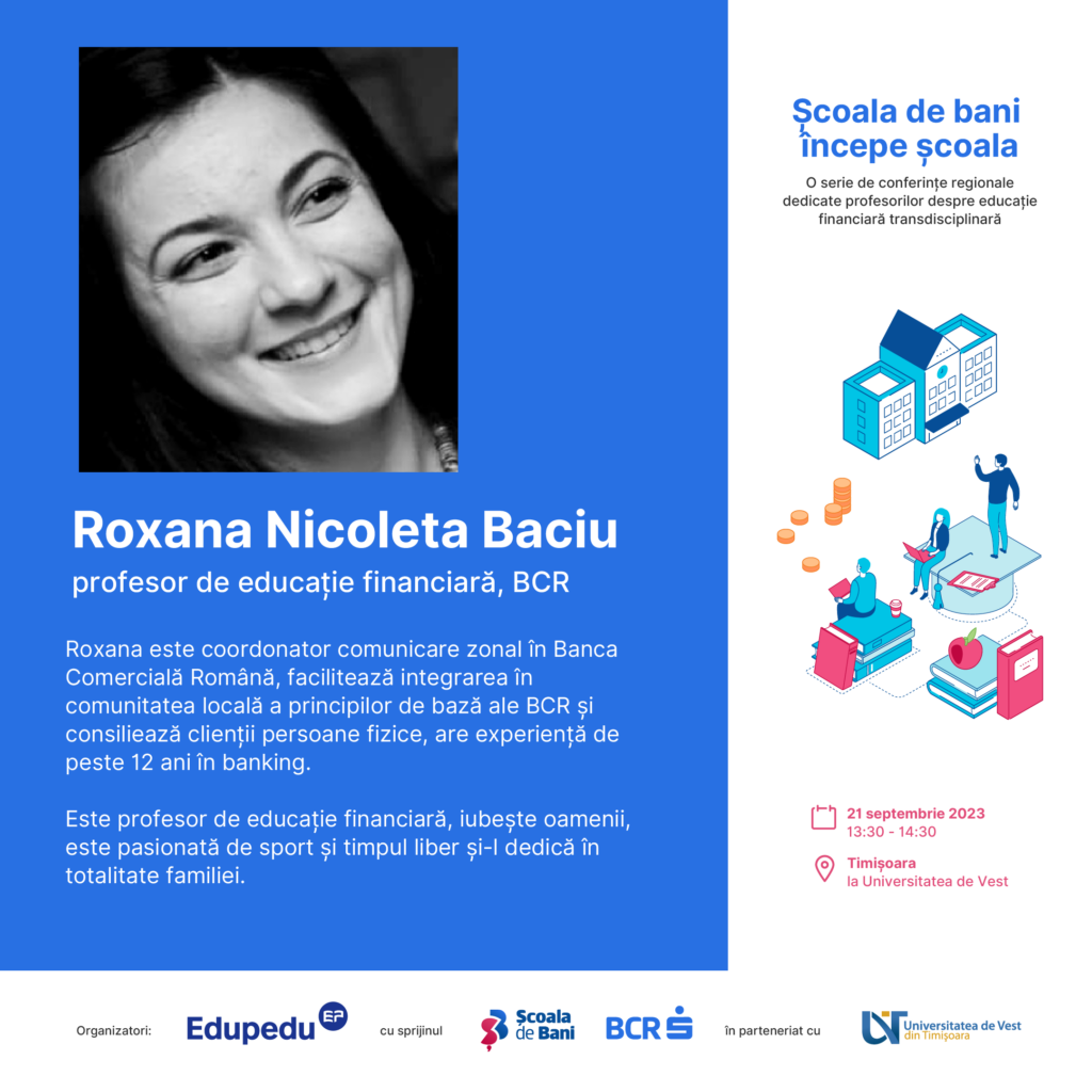 Prima conferință are loc la Timișoara, la Universitatea de Vest, pe 21 septembrie 2023, între orele 13:30 – 16:00. În cadrul acesteia, participanții vor interacționa și în cadrul unui atelier de educație financiară, pentru care vor primi adeverințe, pe lângă ocazia de a discuta cu experții și organizatorii din proiect.