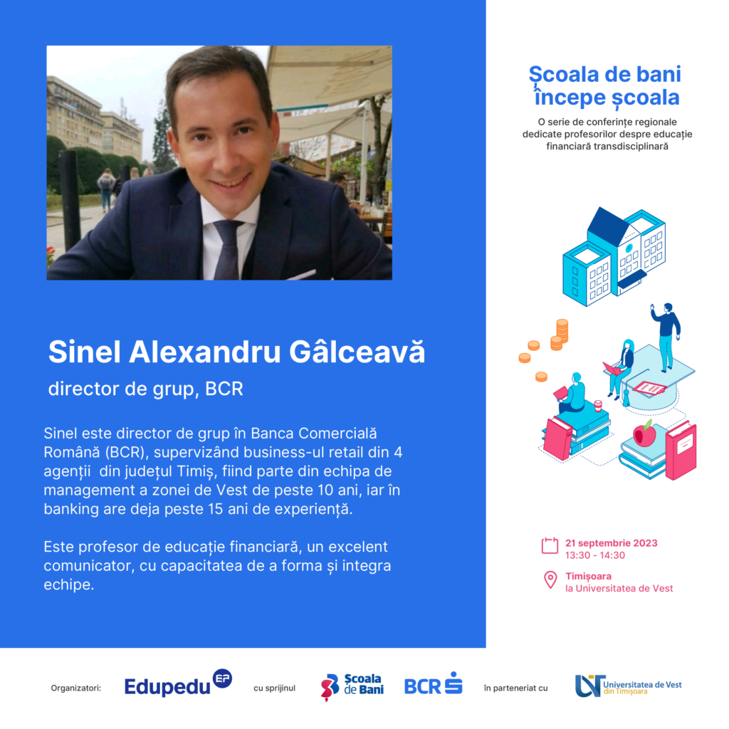 14:20 – 14:30 Prezentarea programului Școala de bani și a inițiativelor de educație financiară pe care BCR le derulează de peste 7 ani: Sinel Alexandru Gâlceavă, director de grup, BCR