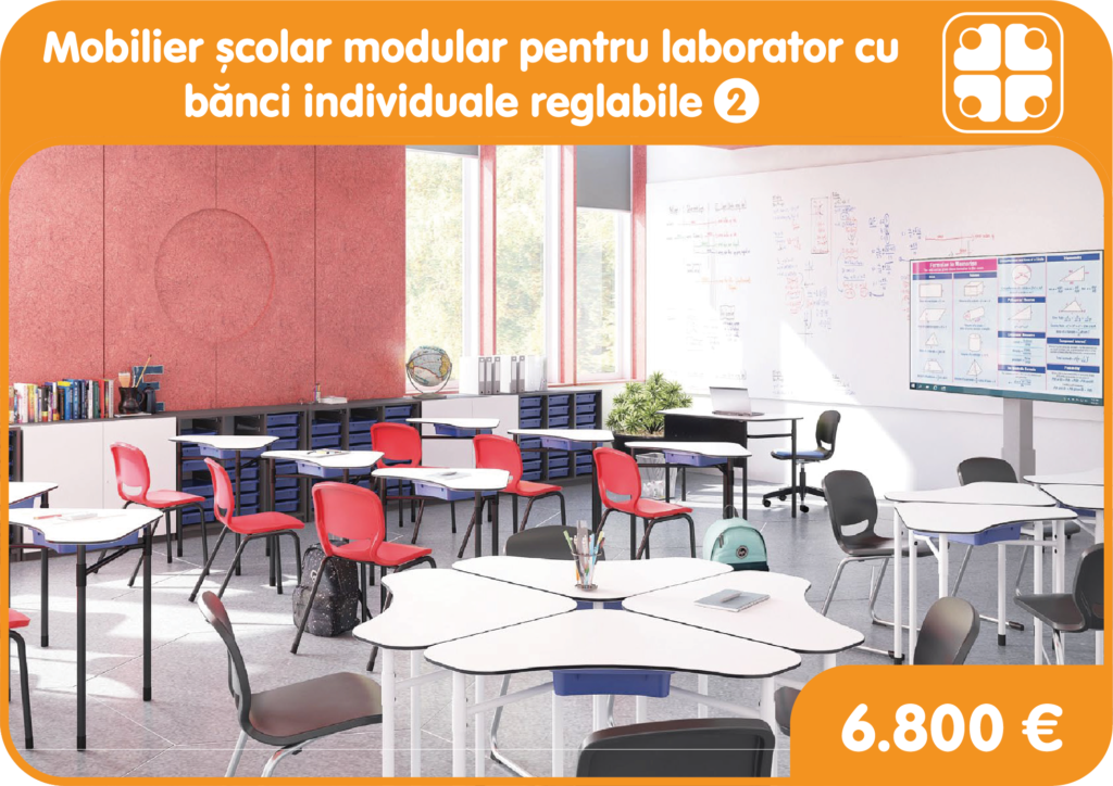 Mobilier cu așezare modulară multiplă – pe lângă funcționalitate și calitate superioară, acest tip de mobilier permite reconfigurarea rapidă și fără efort, în funcție de activitățile specifice de la clasă. Recomandarea pentru laboratoarele școlare este de a folosi mobilierul modular cu bănci individuale reglabile, care oferă posibilitatea de a crea spații deschise sau grupuri, în funcție de nevoile elevilor și profesorilor.