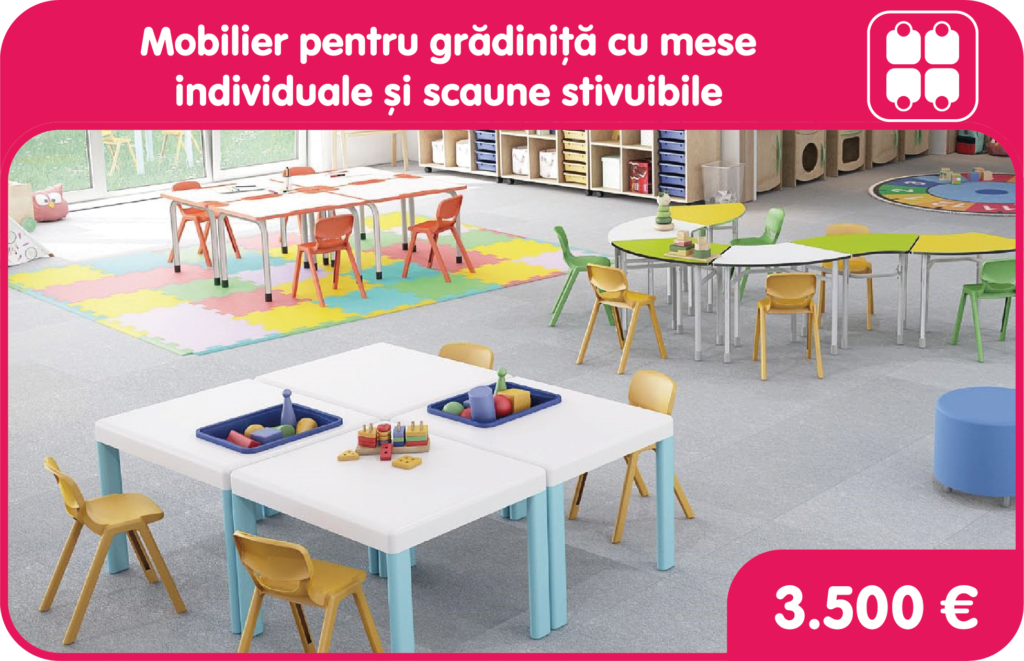 Mobilier cu așezare flexibilă pentru activități de grup – mobilierul propus permite copiilor să lucreze în echipe, să se concentreze asupra unui proiect comun și să colaboreze în mod eficient. Acest tip de mobilier oferă un mediu de învățare interactiv și creativ, care poate ajuta la creșterea interesului și motivației în rândul elevilor. Editura Diana pune la dispoziția unităților școlare două variante de mobilier cu așezare flexibilă, și anume mobilier modular pentru atelierul de practică, format din bănci individuale reglabile și scaune multifuncționale și mobilier pentru grădiniță, cu mese individuale și scaune stivuibile.