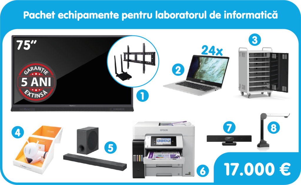 Pachetul echipamentelor TIC pentru laboratorul de informatică oferă școlilor un mediu adecvat pentru învățarea programării și a tehnologiei informației. Acest pachet include un display interactiv Viewsonic, laptop-uri, stație de încărcare mobilă, robot programabil, multifunctională, scanner, cameră videoconferințe și sistem de sunet.