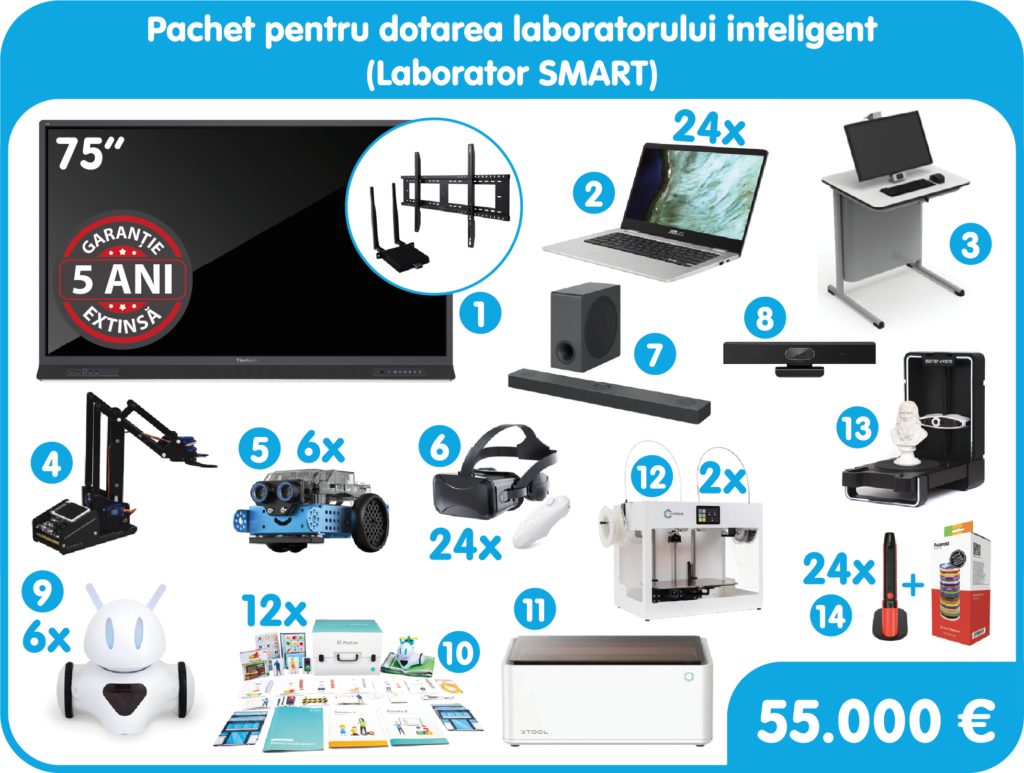 Pachetul pentru dotarea unui laborator inteligent cuprinde echipamente și materiale necesare pentru a crea un mediu de învățare modern și interactiv, cu aplicabilitate în viața de zi cu zi. Acest pachet include o tablă interactivă Viewsonic, ochelari VR, laptopuri, braț robotic și kituri robotice, sistem de sunet, imprimantă 3D, scanner 3D, creioane 3D și acces la platforme educaționale.