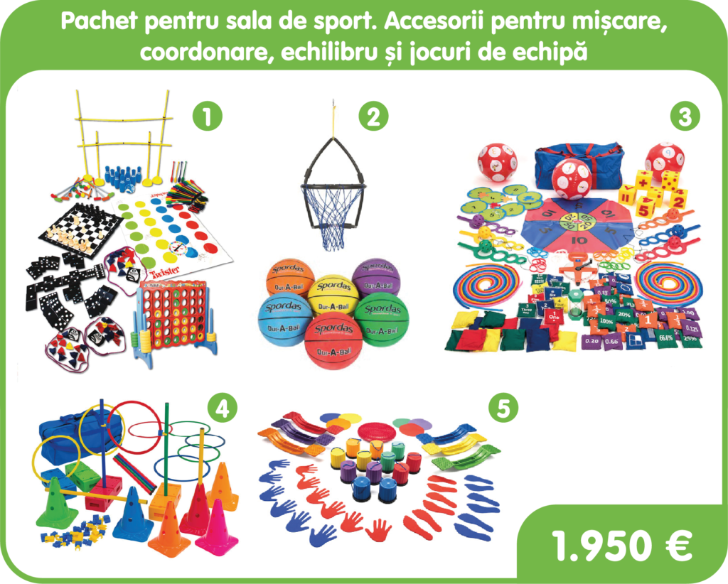 Pachetul pentru sala de sport este format din accesorii pentru mișcare, coordonare și echilibru, precum jocuri de strategie pentru terenul de sport, accesorii pentru antrenamente sportive, accesorii pentru balans, dar și accesorii pentru jocuri de echipă.