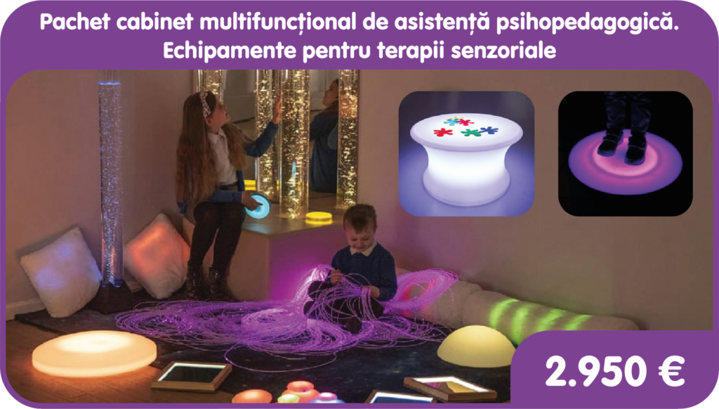 Pachetul pentru dotare a cabinetului de asistență psihopedagogică cuprinde materiale și echipamente interactive pentru a oferi terapii multi-senzoriale. Include tub cu bule, plăci luminoase de podea, fibră optică, pietre senzoriale luminoase, cutie de explorare cu nisip de siliciu și masă luminoasă cu forme tactile.