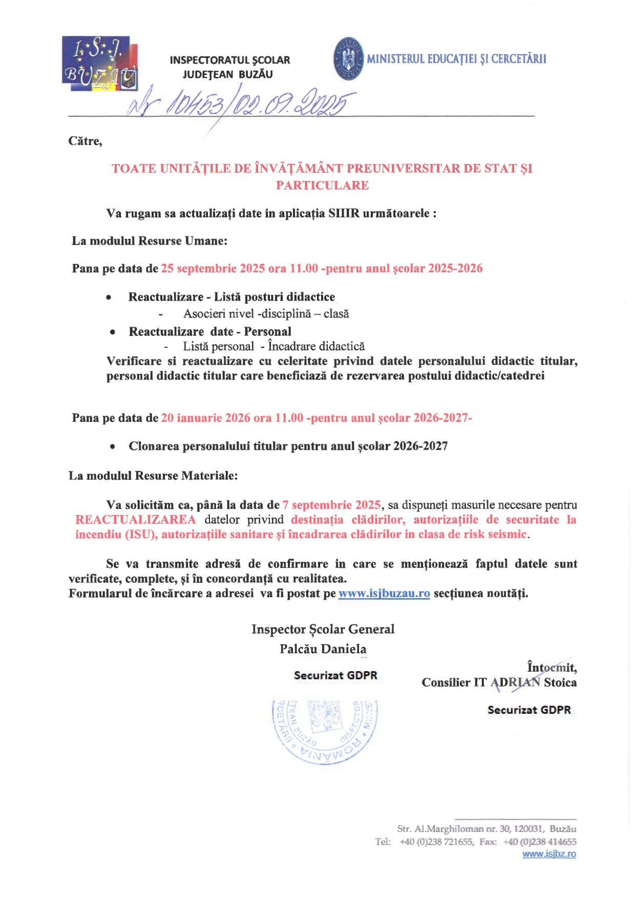 „Va rugam sa actualizați date în aplicația SIIIR următoarele: La modulul Resurse Umane: Până pe data de 25 septembrie 2025 ora 11.00 – pentru anul şcolar 2025-2026