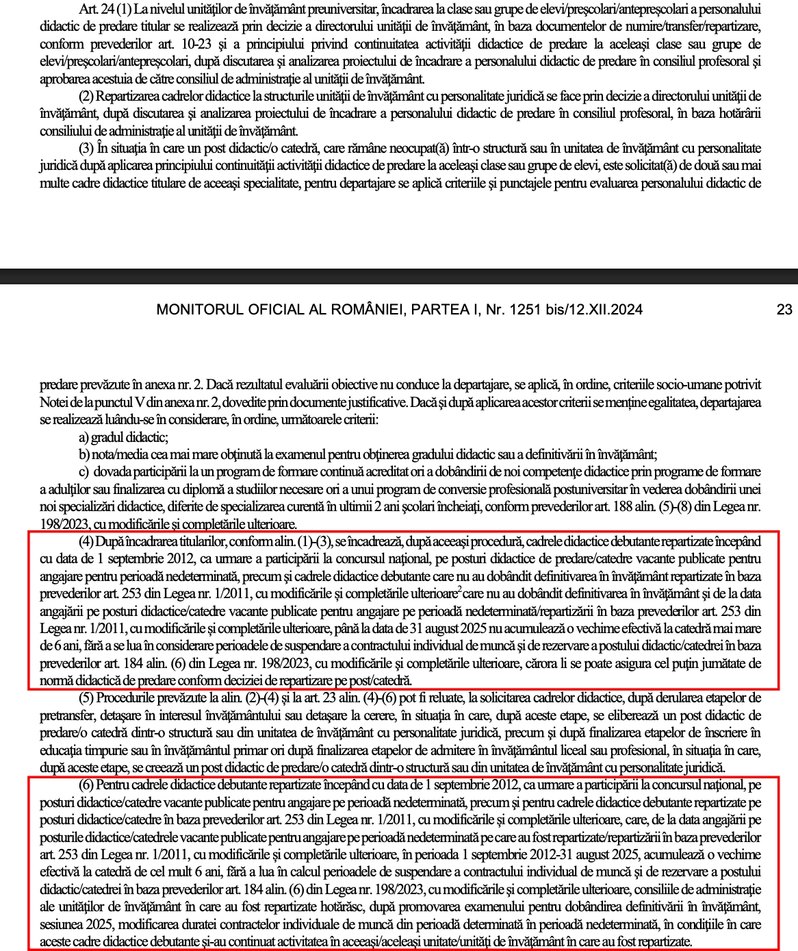Art. 6 – „(2) Prin derogare de la prevederile Metodologiei – cadru, în fiecare unitate de învăţământ de stat, după reconfigurarea formaţiunilor de studiu şi stabilirea numărului total de ore pentru fiecare disciplină, conform planurilor-cadru de învăţământ aprobate prin ordin al ministrului educaţiei și cercetării în vigoare, raportat la numărul de ore din norma didactică corespunzător activităților de predare-învăţare-evaluare stabilite conform prezentei Proceduri, se realizează încadrarea cadrelor didactice, în ordine, după cum urmează: