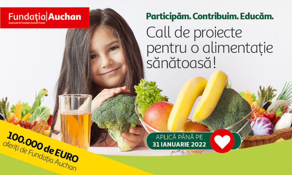 Înscrierile pentru call-ul de proiecte desfășurat de Fundația Auchan dedicat școlilor, universităților și ONG-urilor, cu scopul de a promova accesul la o alimentație sănătoasă, pot fi trimise până la 31 ianuarie 2022. Proiectele pot fi înscrise online aici. Inițiativele inovatoare, cu un puternic impact în societate, care îndeplinesc criteriile necesare, pot beneficia de finanțare până la 100.000 de euro. Câștigătorii vor fi anunțați pe 31 martie 2022.