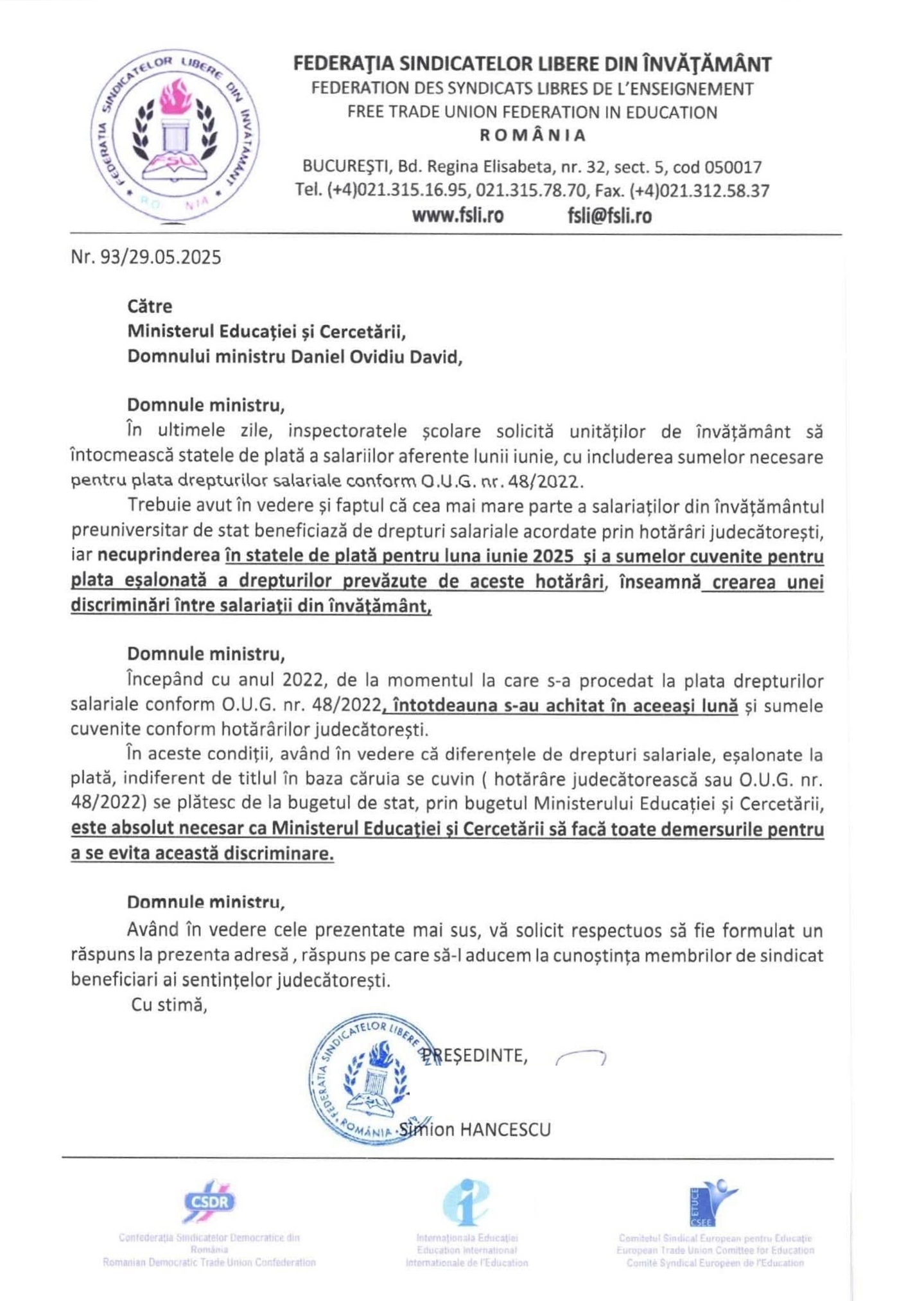 Federația Sindicatelor Libere din Învățământ (FSLI) semnalează că se creează o discriminare între profesori, dacă nu este cuprinsă în statele de plată pentru luna iunie 2025 și plata eșalonată a drepturilor salariale acordate prin hotărâri judecătorești. Este vorba despre o adresă înaintată ministrului Daniel David.