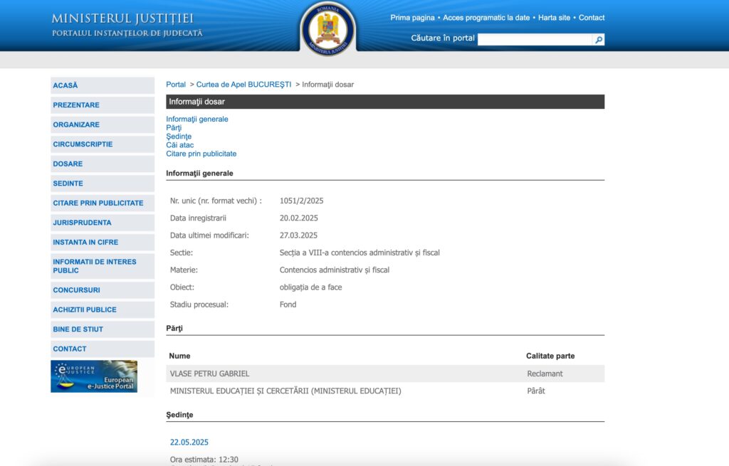 Petru Gabriel Vlase a depus acțiunea pe 20 februarie 2025, la Curtea de Apel București, obiectul fiind „obligaţia de a face”, iar pârât – Ministerul Educației și Cercetării. Primul termen al dosarului a fost stabilit pentru data de 22 mai 2025.