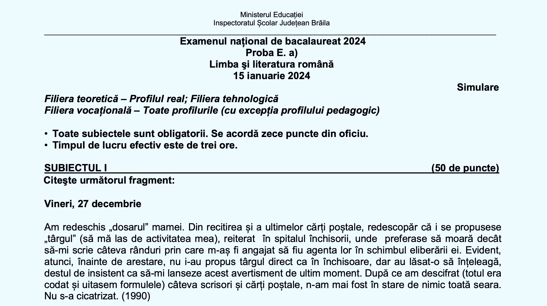 Subiect Limba și literatura română, Simulare BAC 2024, județul Brăila, pentru Filiera teoretică – Profilul real; Filiera tehnologică, Filiera vocațională – Toate profilurile (cu excepția profilului pedagogic):