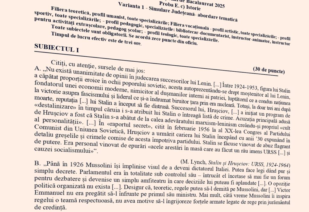 DOCUMENT DESCARCĂ Subiect simulare BAC 2026 – Istorie, varianta 1, decembrie, județul Timiș: