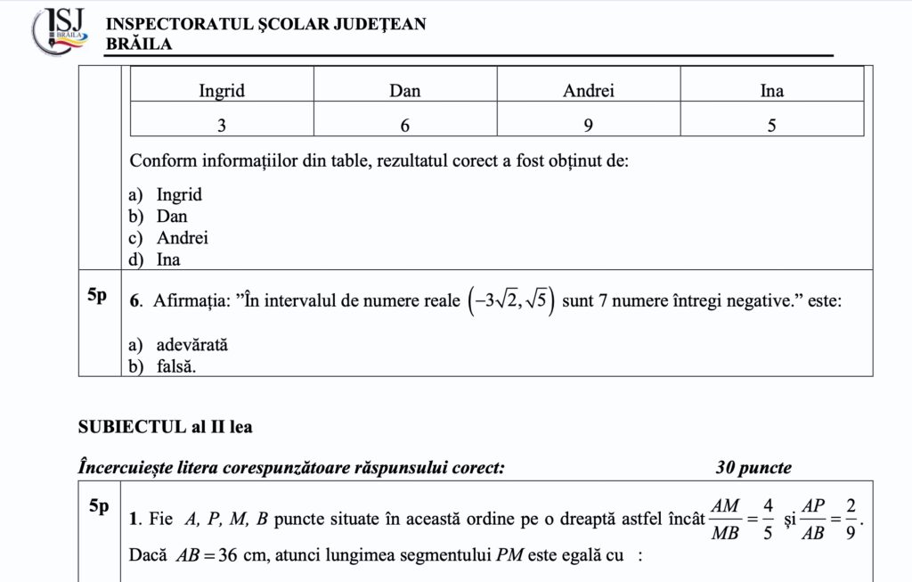 Barem Matematică – simulare Evaluare Națională 2026, Brăila