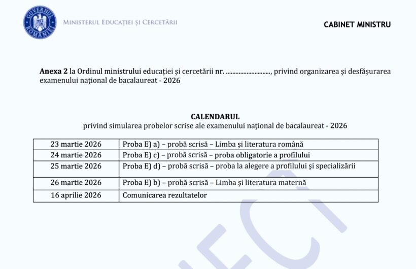 Calendarul privind simularea probelor scrise ale examenului național de bacalaureat 2026 a fost pus în consultare publică de Ministerul Educației şi Cercetării marți, 12 august. Acesta face parte din proiectul de ordin privind organizarea și desfășurarea examenului național de bacalaureat – 2026.