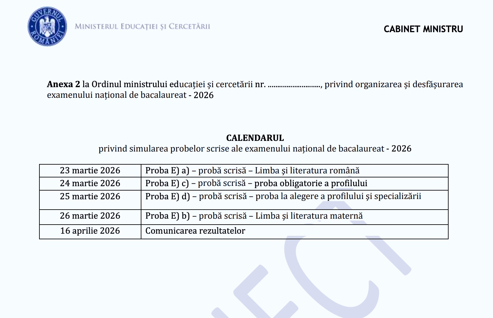 Simularea examenului de Bacalaureat 2026 începe pe 23 martie cu proba la Limba română. Rezultatele vor fi comunicate pe 16 aprilie – proiect calendar