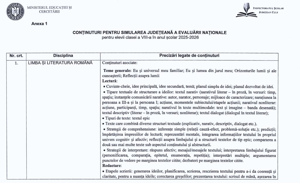 Anexa 1 — Conținuturi pentru simularea județeană a Evaluării Naționale 2026