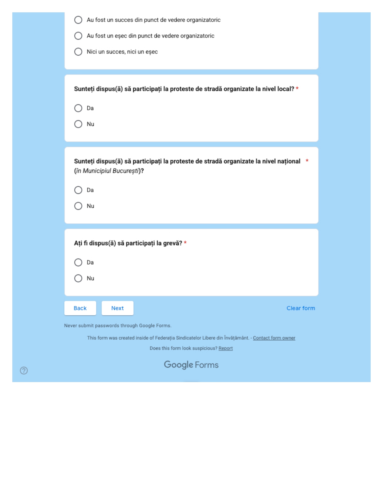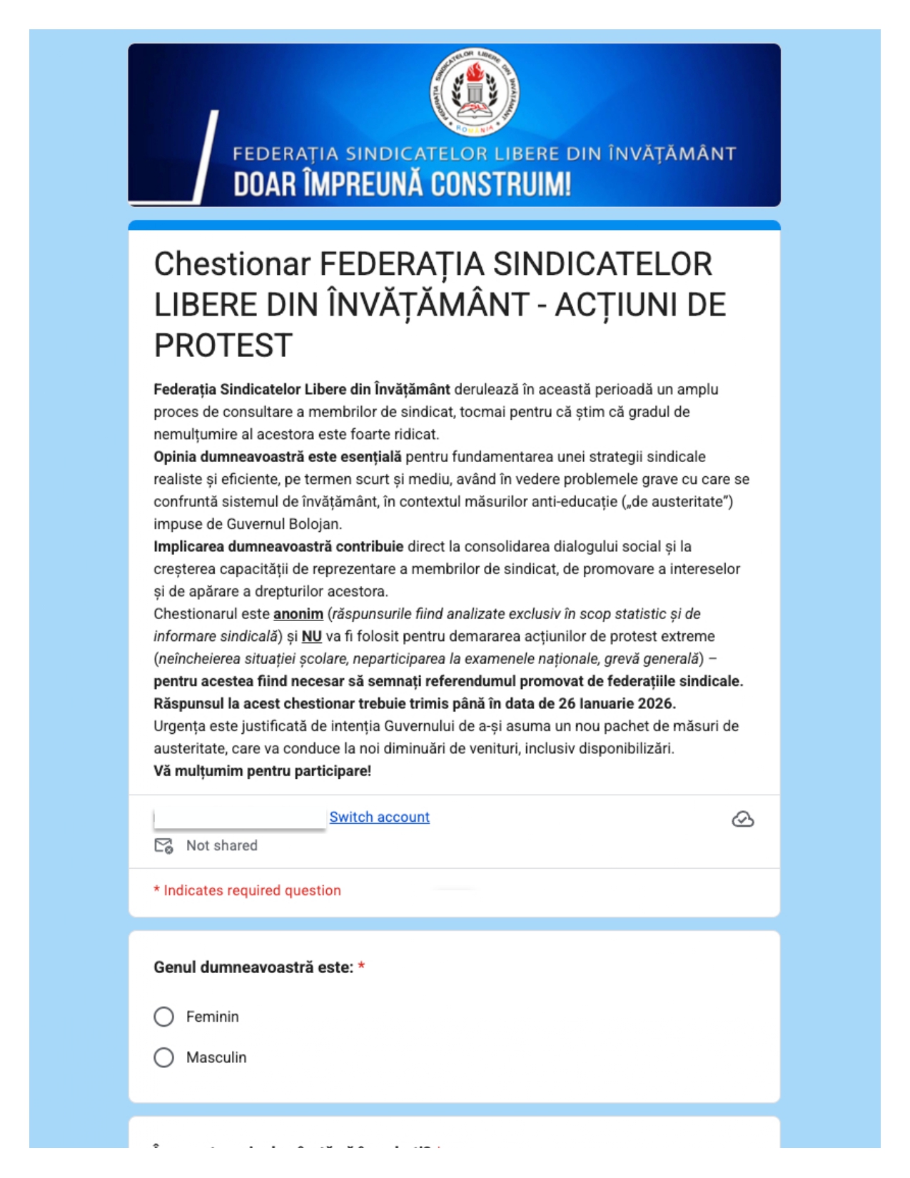 „Este important pentru noi să știm care sunt formele de protest pe care le susțineți. Vă rugăm ca acest chestionar să fie completat de către toti membrii de sindicat, cu maximă responsabilitate și sinceritate.