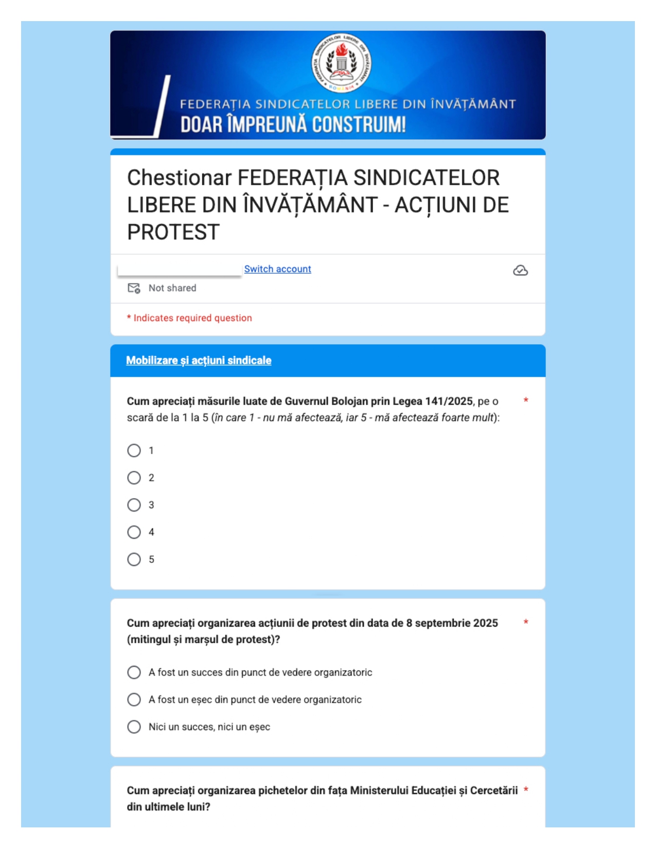 Opinia dumneavoastră este esențială pentru fundamentarea unei strategii sindicale realiste și eficiente, pe termen scurt și mediu, având în vedere problemele grave cu care se confruntă sistemul de învățământ și salariații acestuia, în contextul măsurilor anti-educație („de austeritate”) impuse de Guvernul Bolojan”, se arată în documentul sindicatelor.