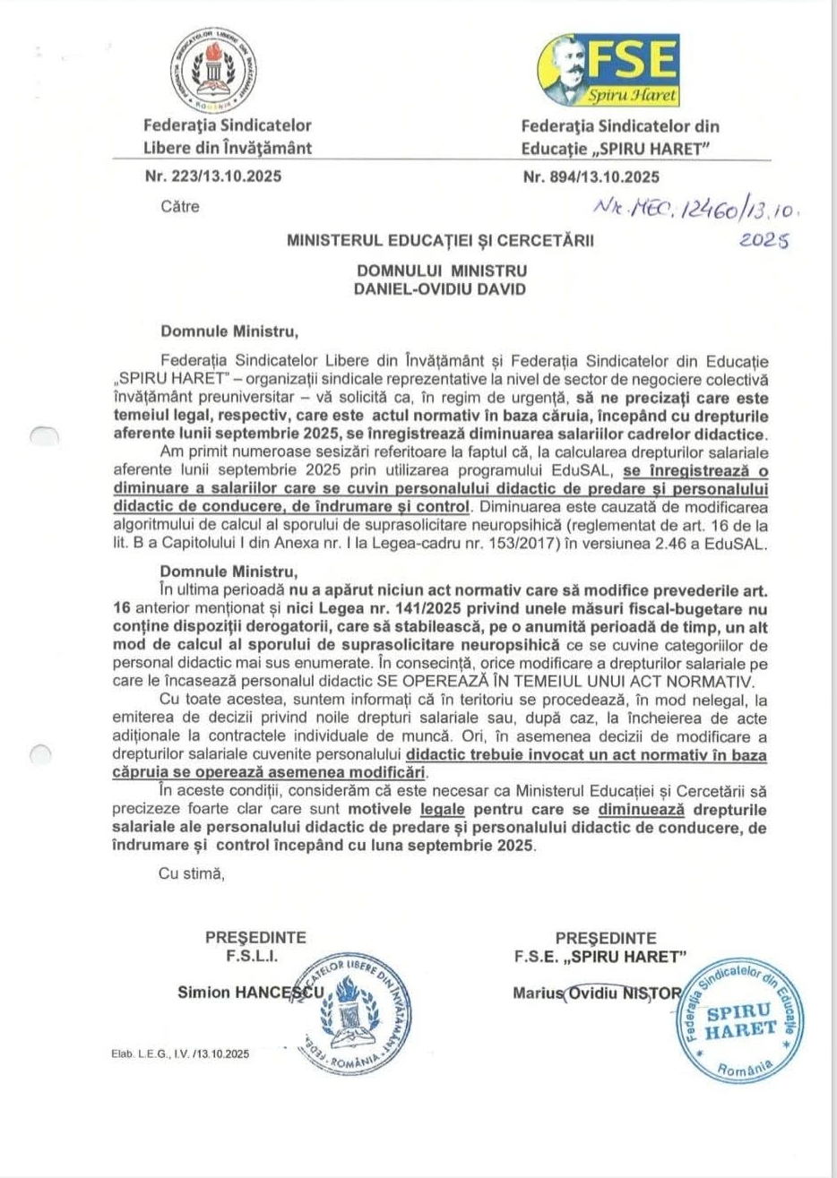 „Federația Sindicatelor Libere din Învăţământ şi Federația Sindicatelor din Educaţie SPIRU HARET” – organizații sindicale reprezentative la nivel de sector de negociere colectivă învăţământ preuniversitar – vă solicită ca, în regim de urgență, să ne precizați care este temeiul legal, respectiv, care este actul normativ în baza căruia, începând cu drepturile aferente lunii septembrie 2025, se înregistrează diminuarea salariilor cadrelor didactice.”, se arată în documentul sindicatelor.