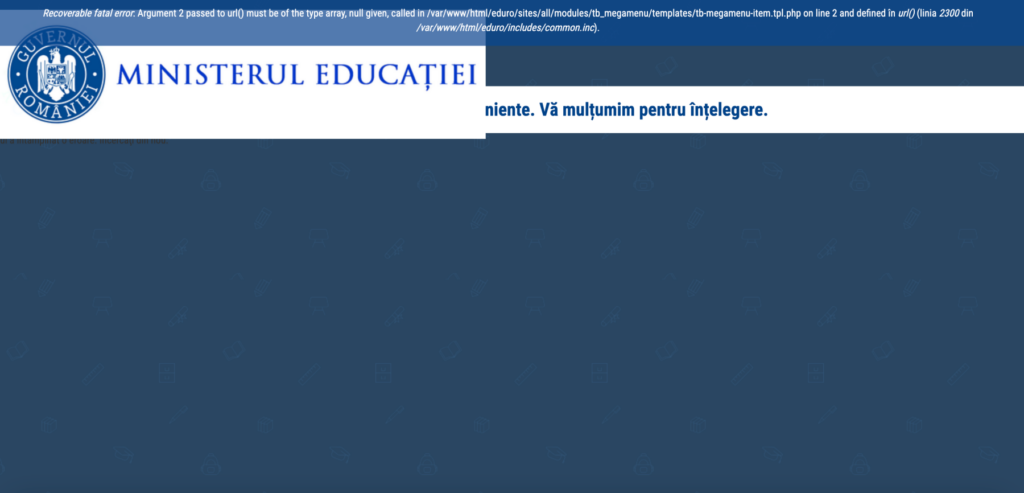 Site-ul Ministerului Educației, edu.ro, nu poate fi accesat, luni, de peste o oră. Inițial apărea fundalul paginii edu.ro dar cu mesajul ce putea fi citit doar parțial: „Mulțumim pentru înțelegere”.