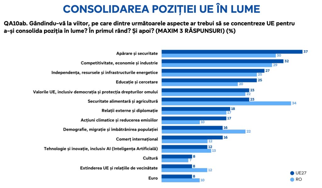 La nivelul României, cele două domenii figurează, de asemenea, printre primele menționate, dar ocupă locul 7, ca procent al respondenților care l-au menționat. 20% dintre respondenții români au menționat aceste domenii drept unele asupra cărora UE ar trebui să se concentreze pe viitor.