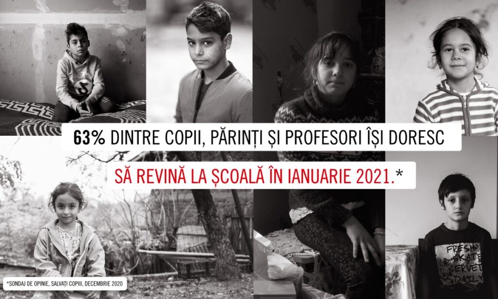 Organizația Salvați Copiii România solicită deschiderea școlilor în luna ianuarie 2021, printr-un apel publicat pe pagina de Facebook. 63% dintre copii, părinți și profesori își doresc să revină la școală în ianuarie 2021, în condițiile în care 47% dintre elevi nu dețin toate resursele ca să învețe online, se arată în comunicarea Salvați Copiii.