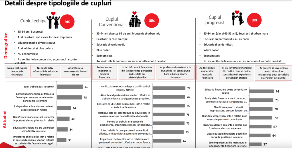 - Cuplul progresist, 31% dintre respondenți – vârsta: 25-35 de ani, locuiesc în București și orașe mari, educație și venit ridicat (n.red peste 6000 lei) economisește, nu are venituri la comun și nici acces unul la contul celuilalt.