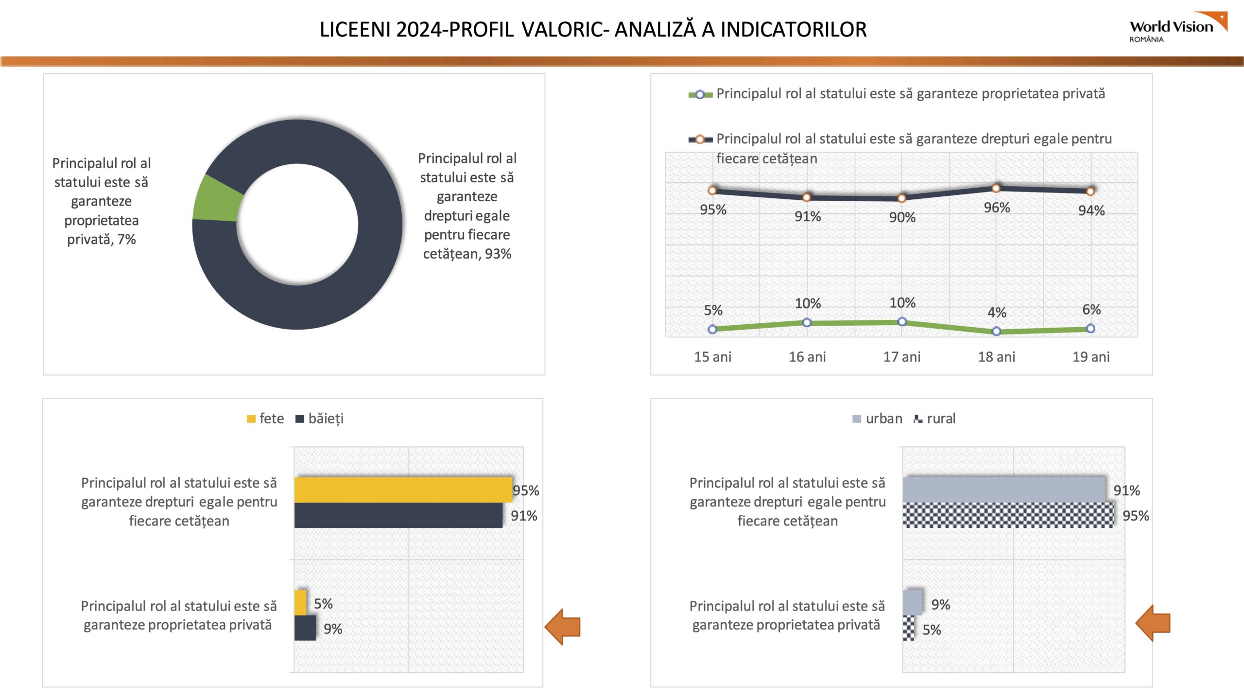 Majoritatea celor 575 de liceeni din 34 de județe, participanți la un sondaj al organizației World Vision România, care au răspuns la un chestionar online, au valori de stânga, conform raportului publicat de sursa citată. Aceasta atitudine tinde să scadă odată cu creșterea în vârstă, ceea ce arată fie o ponderare a valorilor de stânga odată cu maturizarea, fie o creștere a valorilor de stânga în rândul generațiilor care urmează, notează autorii. Nivelul extremismului politic în rândul tinerilor este relativ scăzut, iar băieții sunt mai conservatori decât fetele, conform studiului World Vision România „Profilul ideologic al liceenilor din România”.