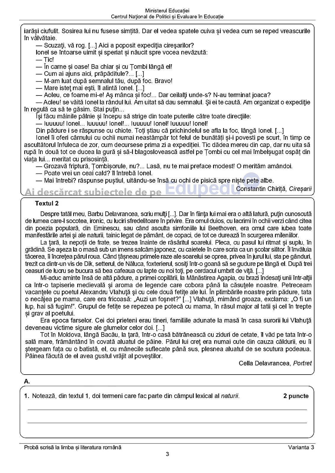 Subiecte Evaluare Națională 2024 – Limba și literatura română: Texte suport din Constantin Chiriţă – „Cireșarii” și din Cella Delavrancea – „Portret”. La subiectul al II-lea, elevii au avut de făcut o compunere în care să caracterizeze un personaj