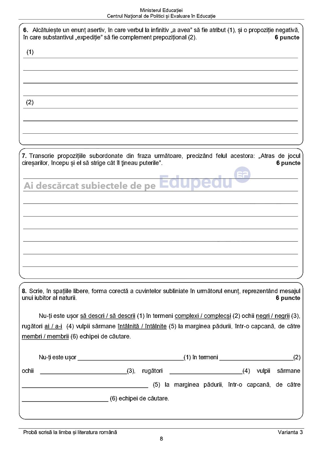 Subiectele pe care le-au avut de rezolvat elevii de clasa a VIII-a:
