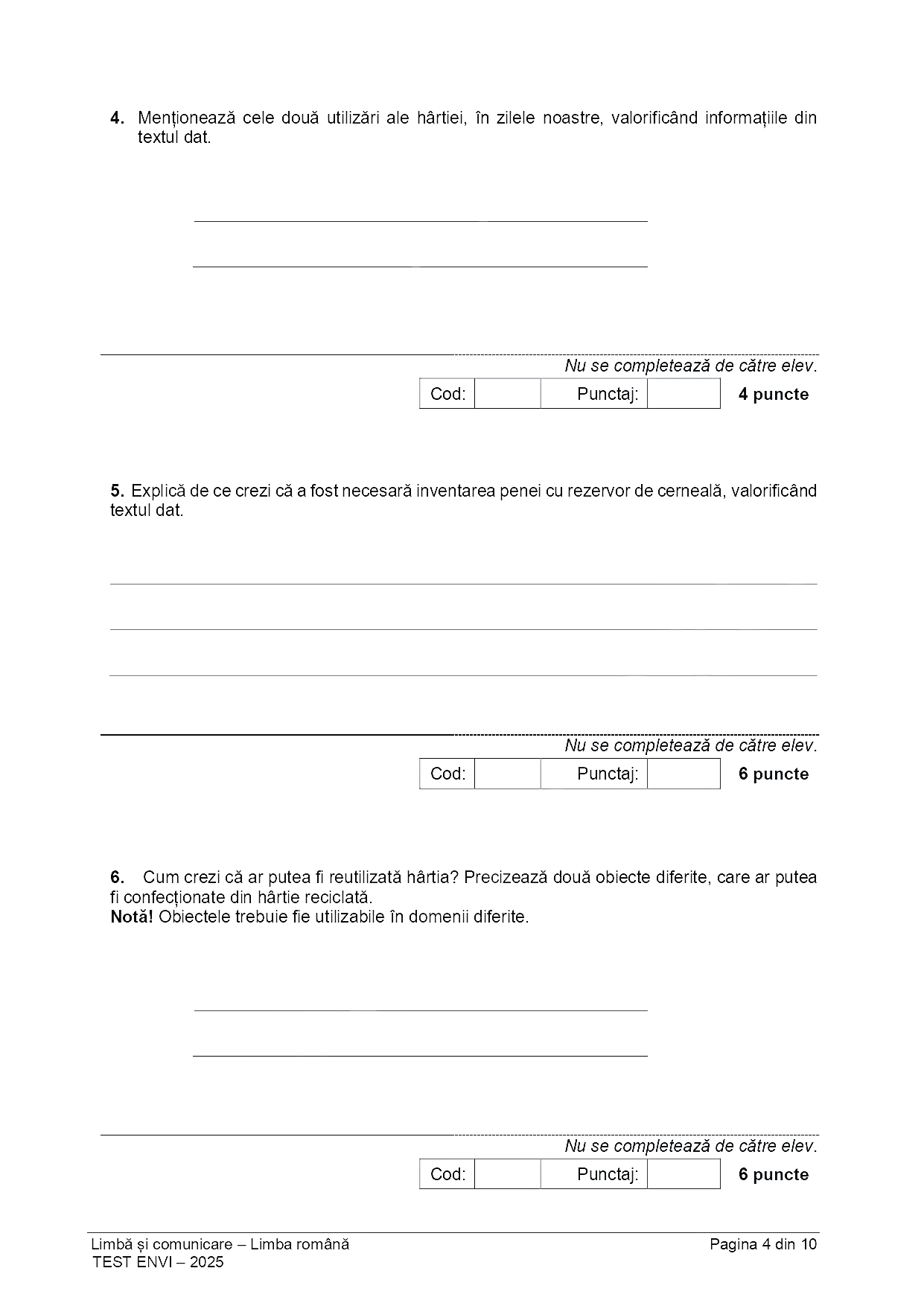 Elevii de clasa a VI-a au susținut marți, 27 mai, proba de Limbă și comunicare din cadrul Evaluării Naționale 2025. Durata alocată rezolvării este de 60 de minute pentru fiecare test administrat (EN VI). Miercuri, 28 mai, are loc proba de Matematică și Științe ale naturii.