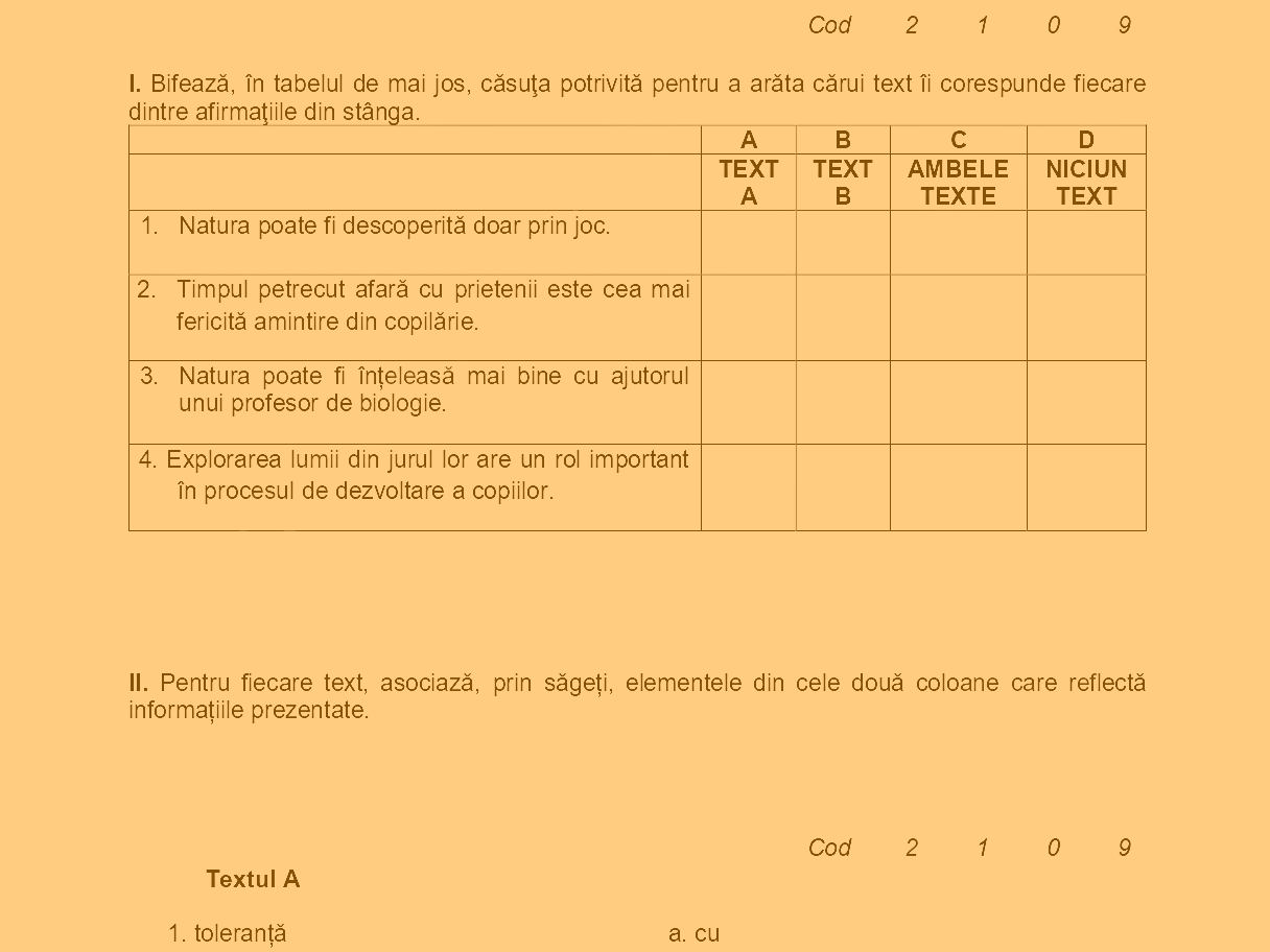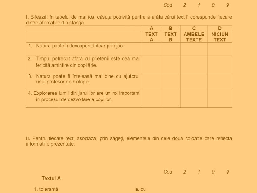 1. Asta e test de logica si corelare, nicidecum romana si limba straina. Au transformat aceste discipline in niste cawcaturi la aceasta evaluare.