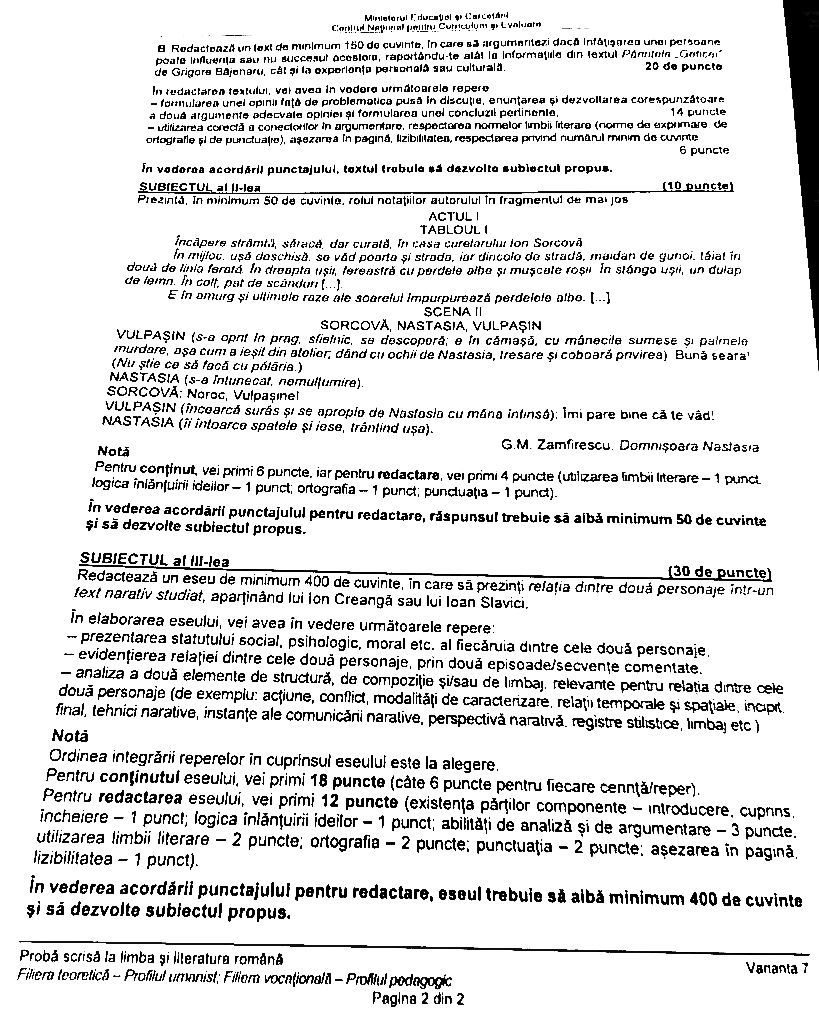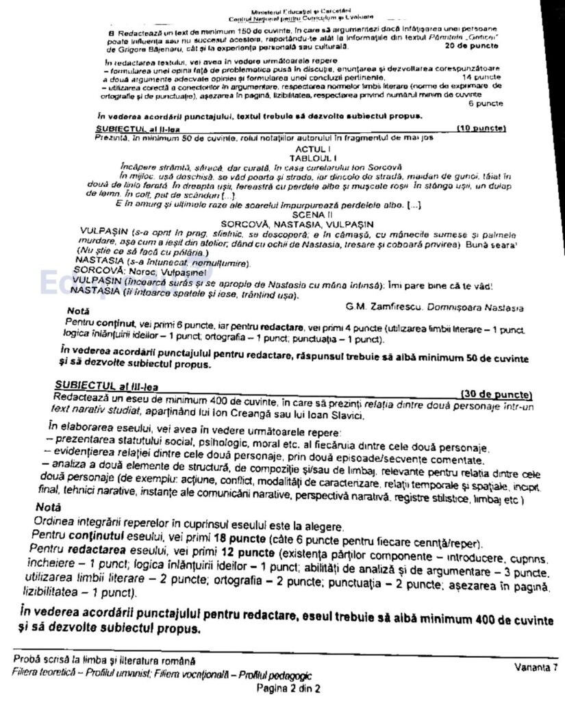 La subiectul al III-lea, cerința primită a fost să redacteze un eseu de minimum 400 de cuvinte, în care să prezinte relația dintre două personaje într-un text narativ studiat, aparținând lui Ion Creangă sau lui Ioan Slavici.