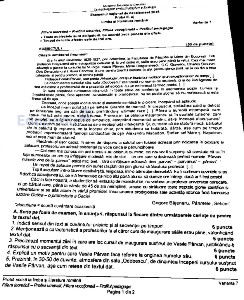 Varianta extrasă pentru proba scrisă de Limba și literatura română – profilurile umanist și pedagogic – a fost cea cu numărul 7. Marți, 10 iunie, absolvenții de liceu au susținut proba scrisă la Limba și literatura română din cadrul examenului național de Bacalaureat 2025.