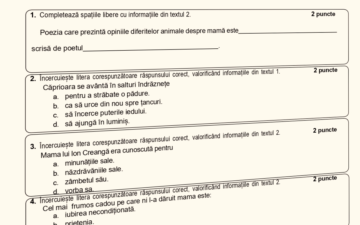 La subiectul al II-lea elevii au avut de redactat o pagină de jurnal. „Imaginează-ți că petreci o zi specială alături de mama ta sau de o persoană dragă care are un rol matern. Redactează o pagină de jurnal, de minimum 150 de cuvinte, în care să prezinți o întâmplare din acea zi care te-a emoționat, incluzând o secvență descriptivă, de minimum 30 de cuvinte. Data redactării jurnalului este 8 septembrie 2025”, a fost cerința primită de elevii din Mehedinți.