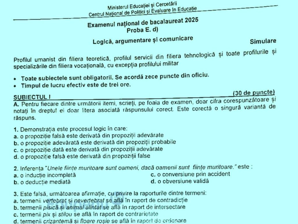Elevii de clasa a XII-a au dat miercuri, 26 martie, simularea probei la alegere a profilului și specializării. Timpul de redactare a subiectelor pentru fiecare probă scrisă a fost de 180 de minute și s-a calculat imediat după distribuirea, către candidați, a subiectelor. Vezi mai jos ce au primit elevii care au ales disciplina Logică.