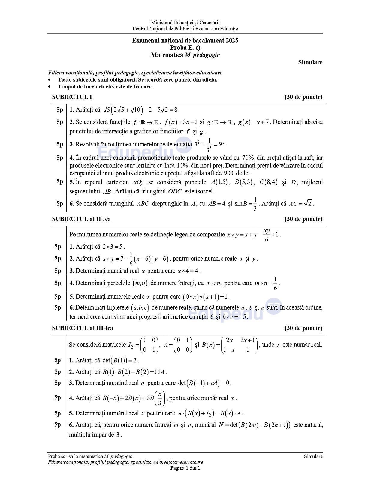 - Subiecte Matematică – simulare BAC 2025, specializarea Științele naturii