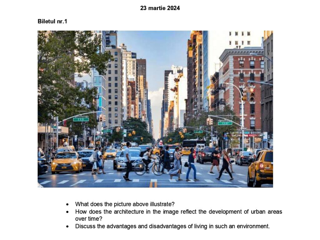 De exemplu, la clasa a XII-a secțiunea A, biletul cu numărul 1 a avut ca bază o imagine cu o stradă dintr-o metropolă din Statele Unite. Cerințele au fost:
