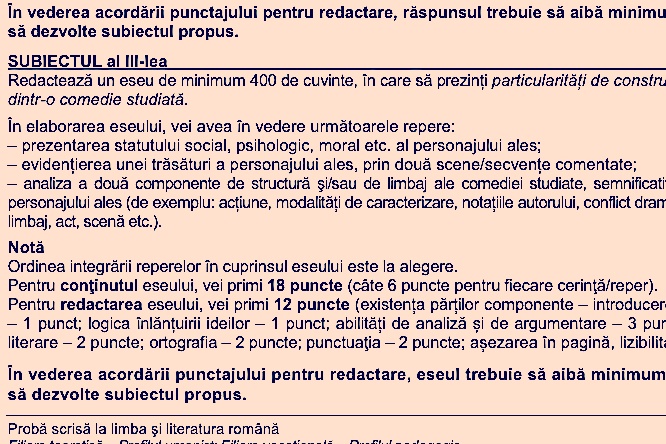Subiectul al III-lea – tinerii au avut de redactat un eseu de minimum 400 de cuvinte, în care să prezinte particularitățile unui prersonaj dintr-o comedie studiată – este notat cu 30 de puncte.