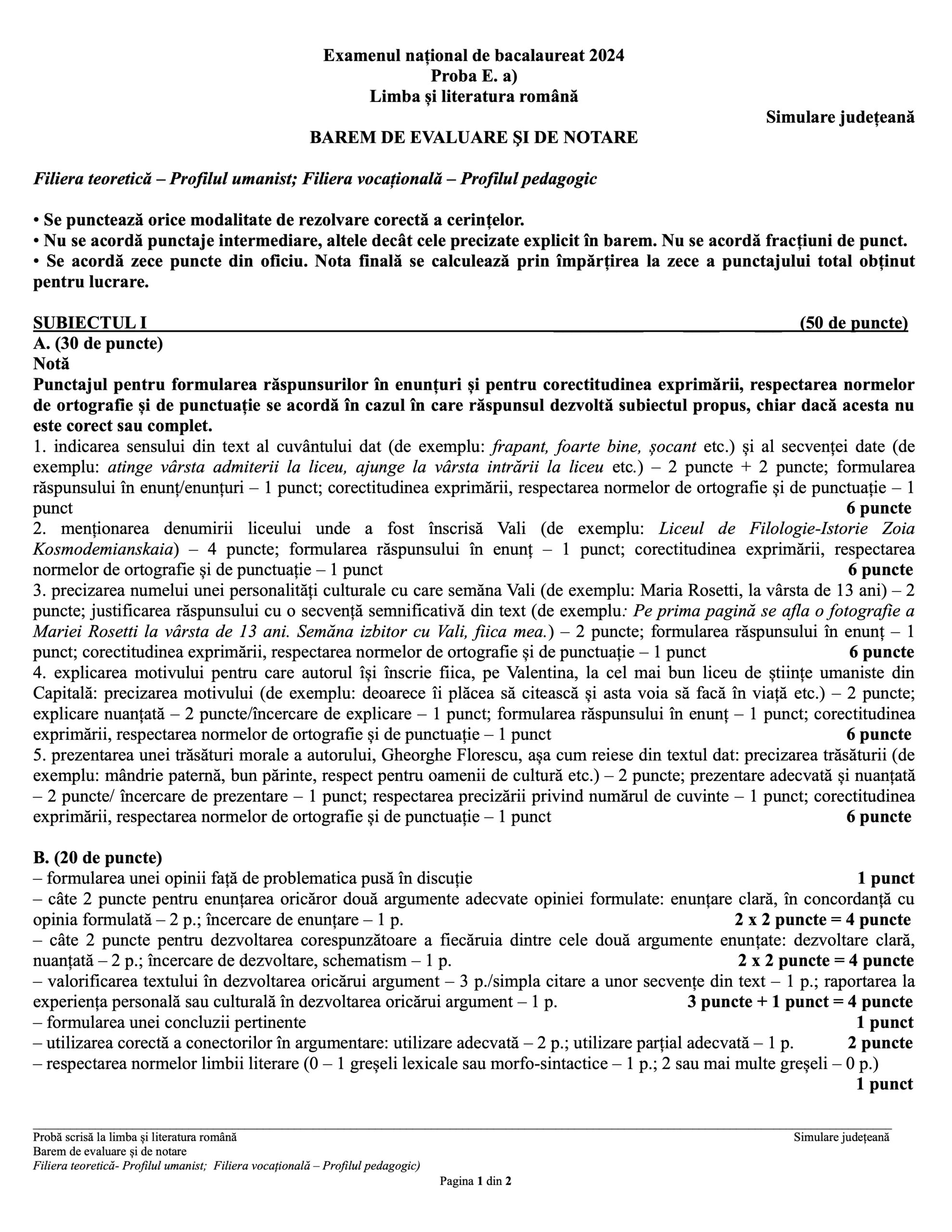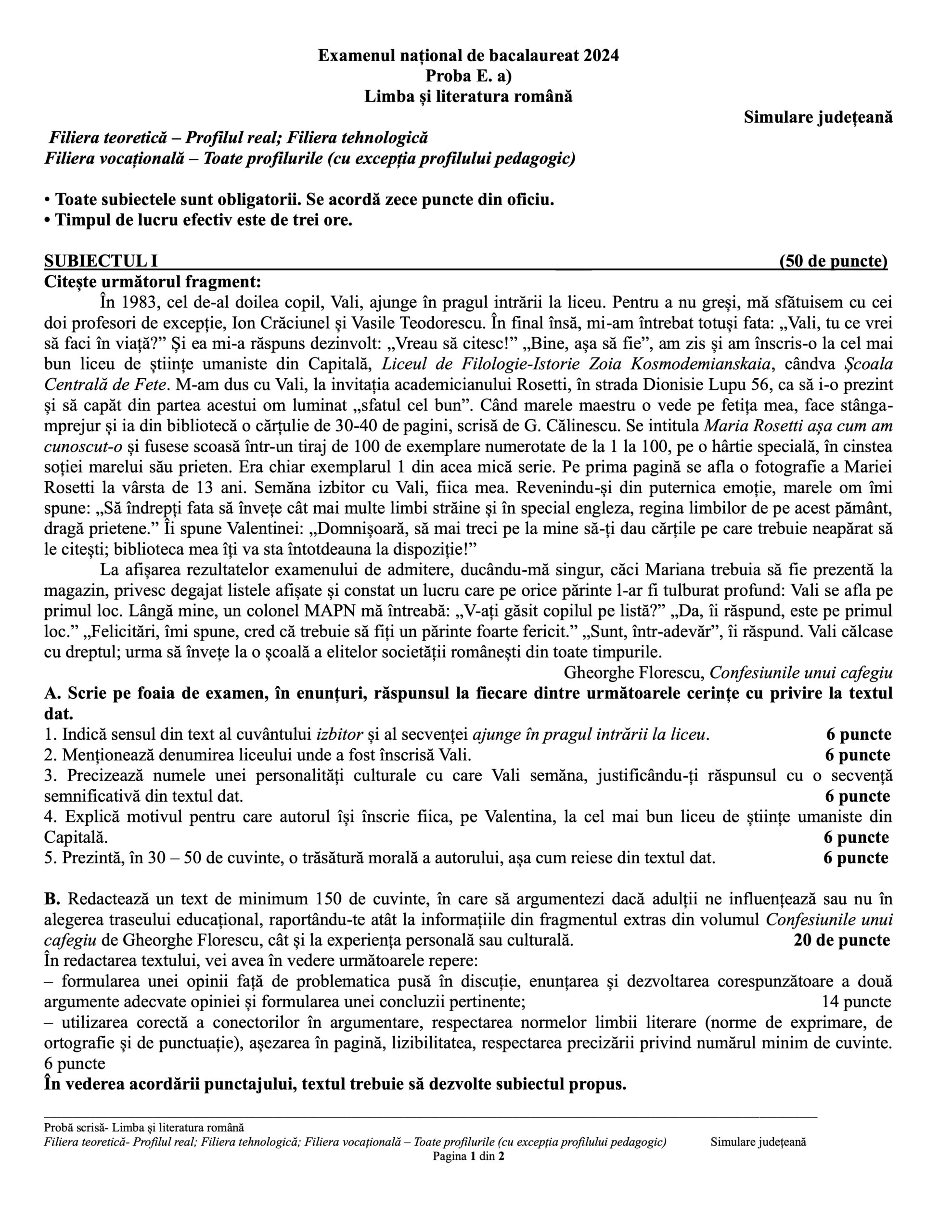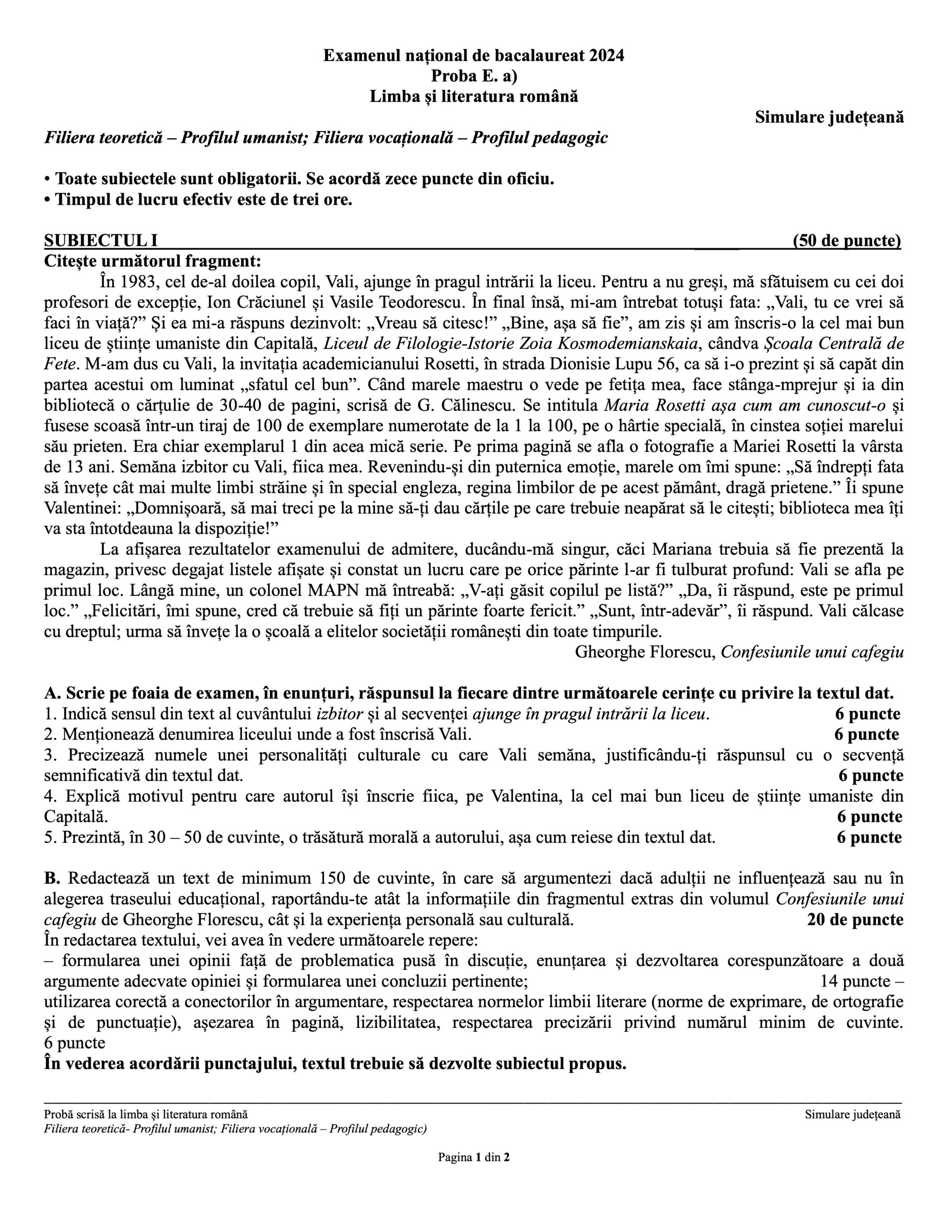 Barem Simulare BAC 2024, Bacău – Limba și literatura română pentru Filiera teoretică – Profilul umanist
