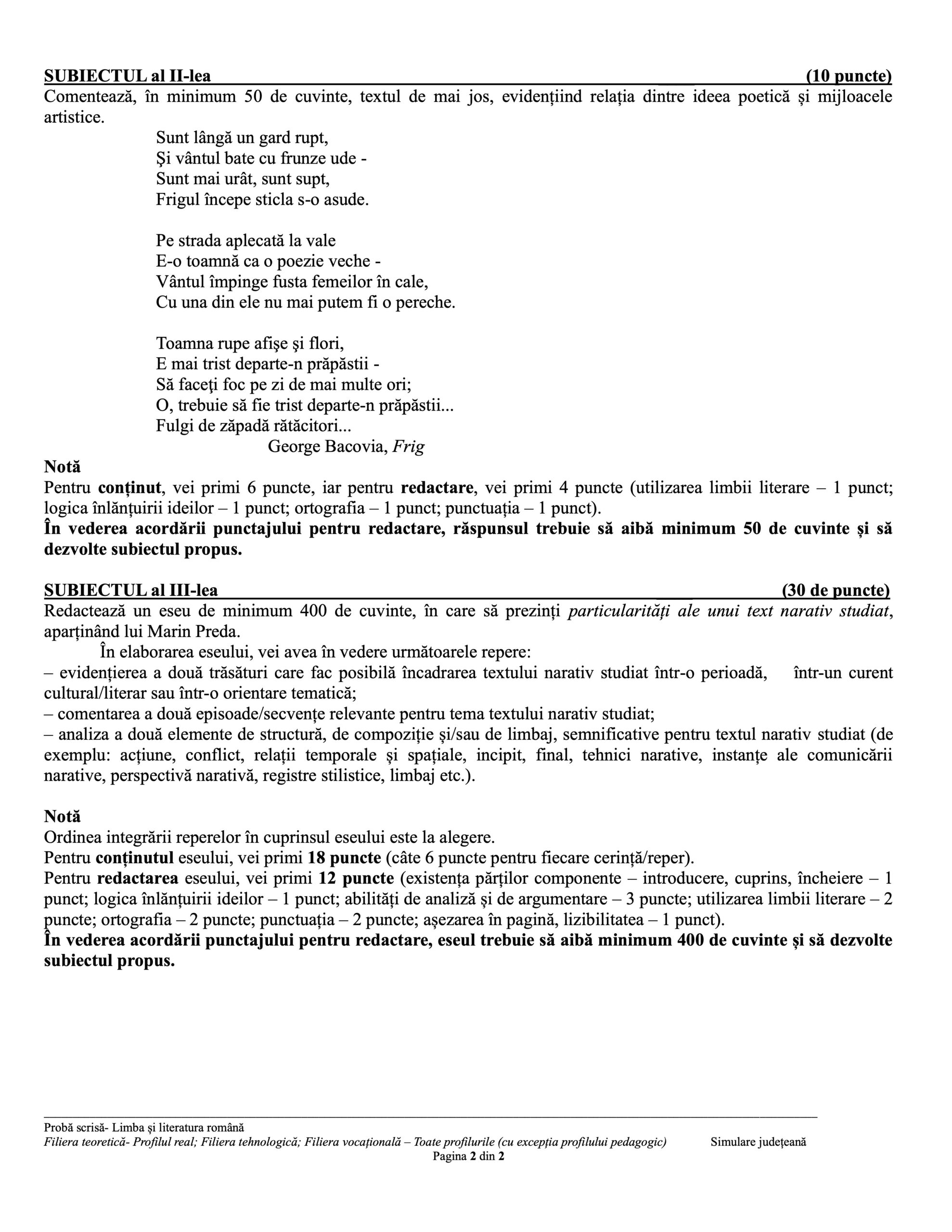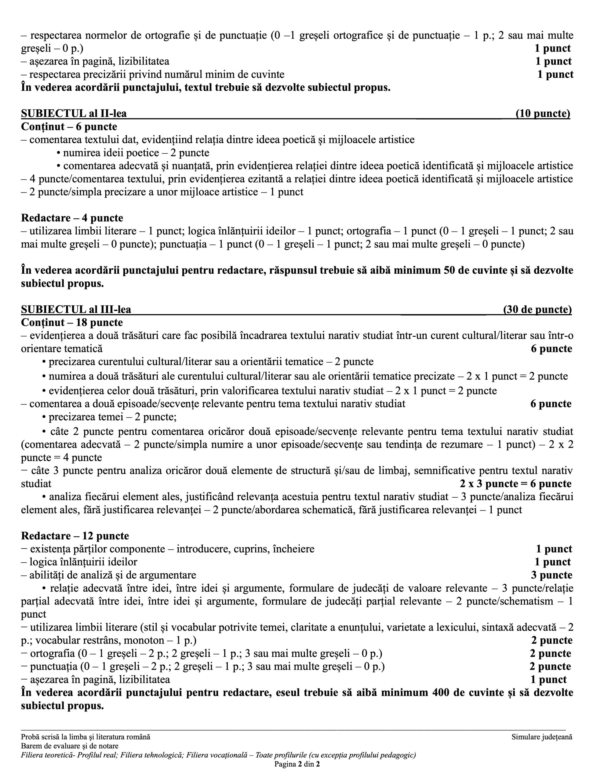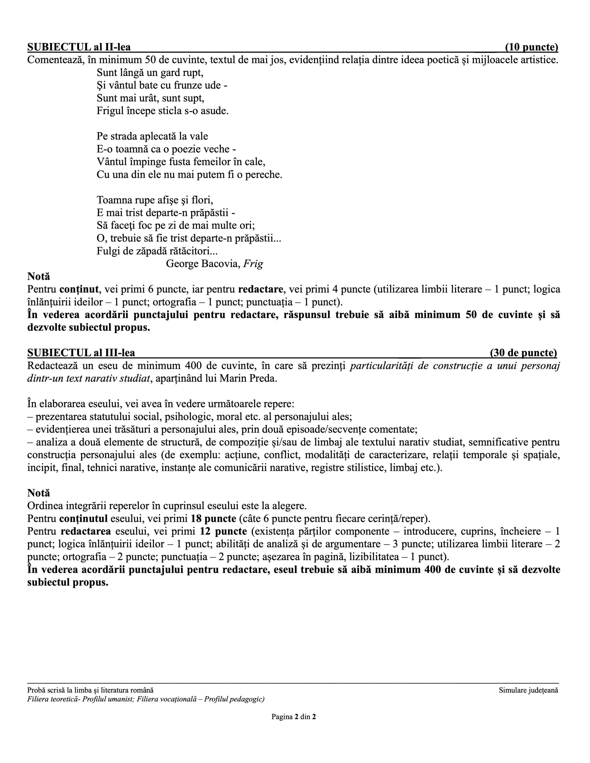 Barem Simulare BAC 2024, Bacău – Limba și literatura română pentru Filiera teoretică – Profilul umanist