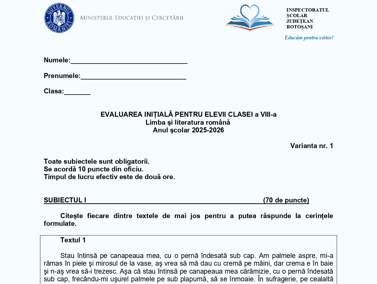 Subiecte limba și literatura română varianta nr. 1 – Testare inițială clasa a VIII-a, 2025-2026