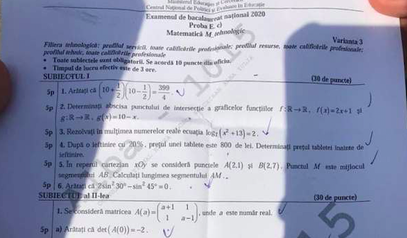 Sesiunea de toamnă a Bacalaureatului 2020 continuă astăzi cu proba obligatorie a profilului. Absolvenții liceelor cu profil real susțin examenul la Matematică, care are patru variante de subiecte. Alba24.ro a publicat varianta de subiecte primite de elevii care au absolvit profilul Tehnologic.