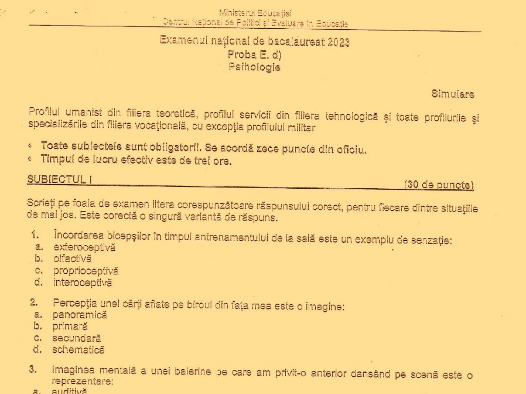 Elevii de clasa a XII-a au dat astăzi simularea probei la alegere a profilului și specializării. La proba de Psihologie, o cerință pe care au primit-o liceenii a fost să formuleze un argument prin care să respingă afirmația că „Inteligența este o aptitudine specială”.