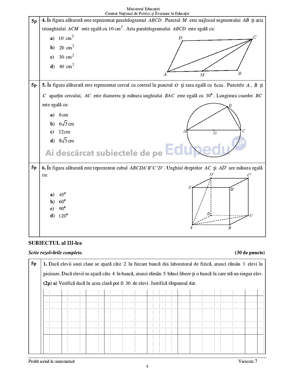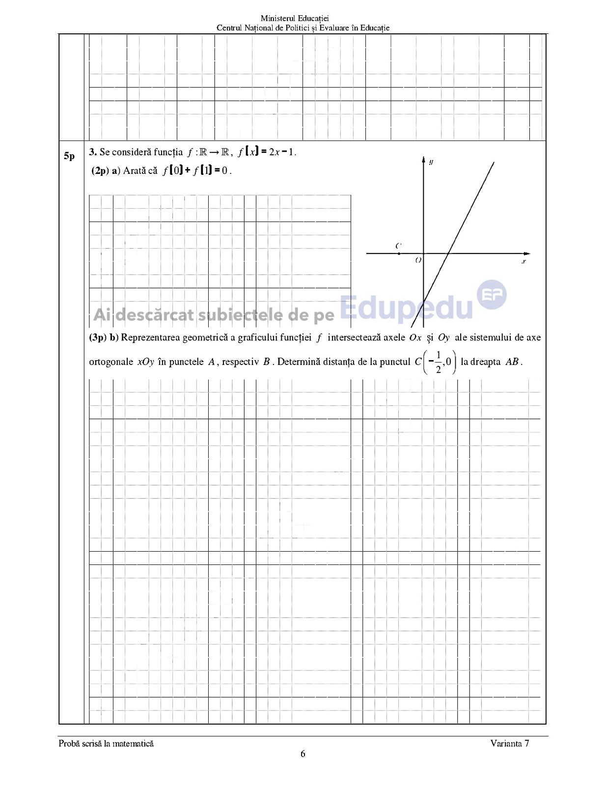 1. sincer eu am facut cu fiul meu de clasa a 7-a subiectul si am calculat un 7 in aprox 15 minute , facute la repezeala. si eu dupa 20 de ani de cand am terminat scoala am putut face de 5,5. nu stiu ce se intampla cu copiii din ziua de azi. precizez ca fiul meu nu ia meditatii pentru ca toti profesorii sunt „plini” de vreo 2 ani inainte de clasa a8-a.