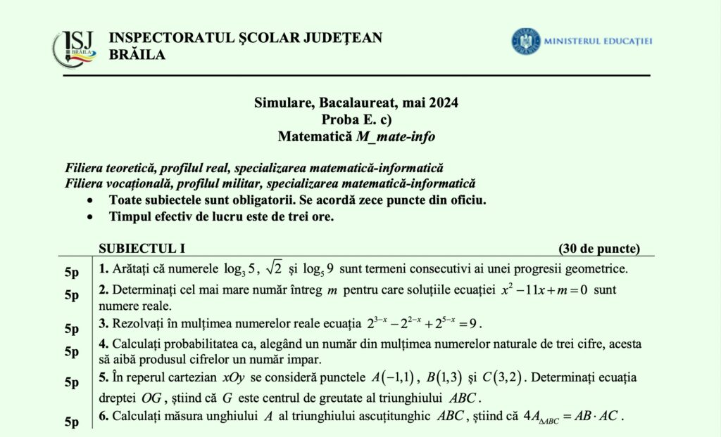 Subiecte Matematica – Simulare BAC 2024, județul Brăila – matematică-informatică