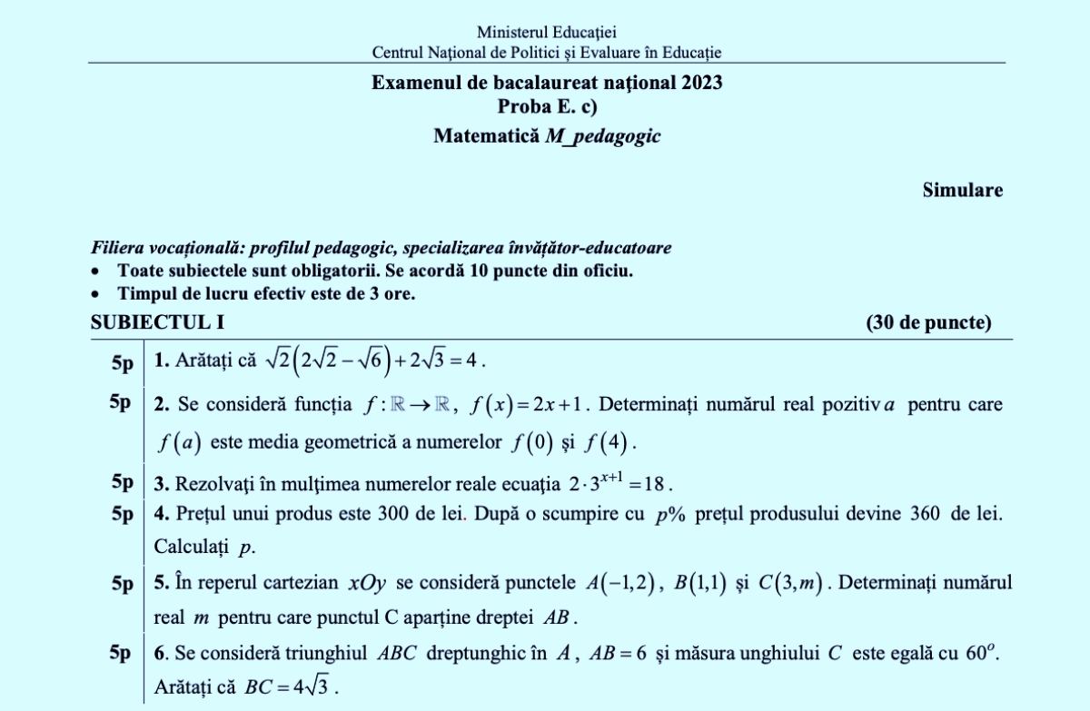 Subiectele și baremul de la proba scrisă obligatorie a profilului au fost publicate de Ministerul Educației. Simularea la Matematică a fost susținută de elevii clasei a XII-a de la profil real, de cei din liceele tehnologice, precum și de către cei cu specializarea învățători-educatoare.