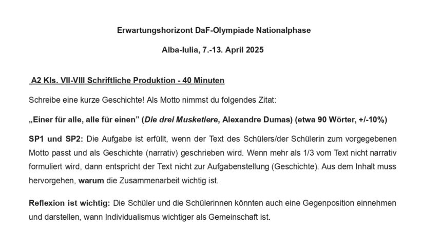Etapa națională a Olimpiadei de Limba Germană Modernă se desfășoară în perioada 07-13 aprilie 2025 la Alba Iulia și participă peste 190 de elevi din țară. Subiectele și baremele au fost publicate de organizatori pe pagina oficială a competiției.